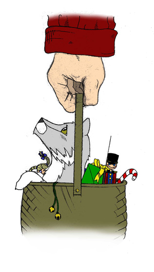 |  | As she warmed the tiny reindeer, she thought back to the terrible day when her mother, father, brothers, and sisters had been killed. Her family was chasing rabbits across the tundra one bright spring day. Millions upon millions of wildflowers were in bloom and it was a glorious day to be alive. At first, the wolves did not hear the sound of the airplane approaching. Then, without warning, the crack of rifle shots rang out from above. The airplane was circling above the wolf family. More shots and her mother lay dying at her side. Just as her father ran over to help her mother, more shots were fired; and soon, her whole family lay dead or dying in the field of flowers. She could hear the laughter of the men in the airplane above the roar of the engine, and then the plane was gone. She had felt a sharp pain in her side but had forgotten it due to the shock of seeing her entire family killed before her eyes. She looked at her side, and blood was coming from an ugly wound. She, too, had been shot; but, fortunately, the bullet had gone through her body without hitting any vital organs. As she was too young to hunt on her own and too weak from loss of blood to search for another wolf family, she found a patch of the softest and most beautiful wildflowers and made herself a bed in which to lie. Soon vultures appeared in the sky and swooped down to feast upon her dead family. As darkness fell, the vultures crouched in a circle around their dinner to spend the night. The little wolf cub was afraid and alone for the first time in her life. Finally, she fell into a troubled sleep.  The next morning she awakened to the sound of whistling. She had never heard a sound like that before; and, there was a strange smell, a smell her mother and father had warned her about -- the smell of humans!!! She quivered in fear in her little bed of flowers and closed her eyes. Then she heard voices. She didn't understand what they were saying, for she only understood the language of wolves. She raised her head above the flowers to take a peek. She saw twelve tiny men weeping at the sight of her dead family, and she could sense that they meant her no harm. She began to whimper, and one of the men heard her cries and went to her. He picked her up and placed her in a wicker basket he was carrying. For several hours, she rocked and swayed in the basket, while peering through the little cracks between the reeds from which the basket had been fashioned. She could see that the little men were carrying heavy baskets full of strange objects. Later she would learn that these were the parts needed for the assembly of toys such as doll heads, little wheels, computer parts, and thousands of other bits and pieces of toys. Then to her further surprise, she heard cheerful voices calling out. When she dared to poke her head above the top of the basket in which she had been riding along with a hundred soft teddy bear bellies, she saw a large, jolly woman and a fat, jolly man in a red suit waving and smiling. (c) 2000 George H. Russell To be continued: If you would like to participate in completing the story of Tiny, the Littlest Reindeer, please submit your ideas to pop123@lcc.net Any submissions become the property of "Russellministries.ORG." Story ideas cannot be returned. The story of Tiny, the Littlest Reindeer is brought to you by Goldenruleministries.ORG. Please visit us on our web site. We ask you to join us in attempting to bring peace and joy to the world. | |